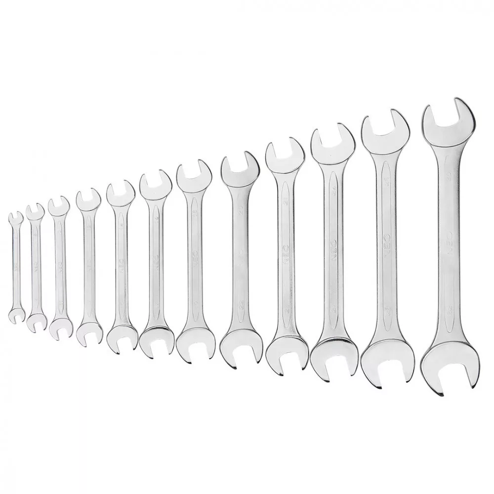 NEO kétvégű villáskulcs készlet népszerű méretű kulcsokat tartalmaz, a kulcsok a DIN 3110 szabványnak megfelelően készülnek. A kiváló minőségű króm-vanádium acél sokéves tartósságot biztosít a kulcsoknak. A kulcsok praktikus, kulcsméreteket feltüntető tokba csomagoltak, ami megkönnyíti rendben tartásukat. A szerszám minőségét bizonyítja a TÜV tanúsítvány és a gyártó által nyújtott 25 éves jótállás. A NEO márka a professzionális igényeket is kielégíti.