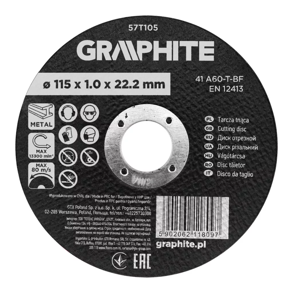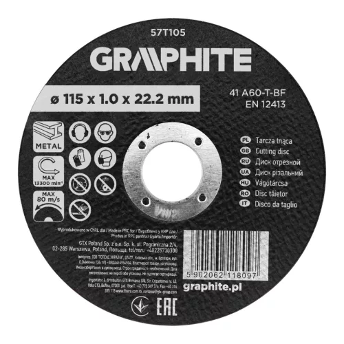 A GRAPHITE 115 x 1 x 22,2 mm, 41 A60-T-BF, 57T105 alumínium-oxid vágókorongja fémekhez 115 x 1 x 22,2 mm, 41 A60-T-BF, 57T105 egy alumínium-oxid korong, amelyet fémek vágására terveztek. Méretei 115 x 1,0 x 22,2 mm. Ez a modell vékony kialakítású és a 41 A60-T-BF jelöléssel rendelkezik. A tárcsa vastagsága 1 mm, a rögzítőfurat átmérője pedig 22,2 mm. A maximális fordulatszám 13 300 rpm, ami 80 m/s sebességnek felel meg. A termék megfelel az EN 12413 szabványnak.