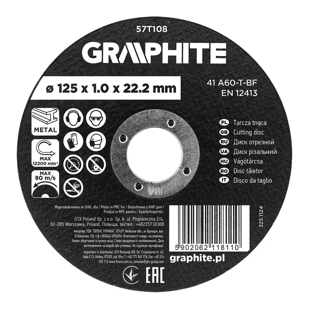 A GRAPHITE alumínium-oxid vágókorongja fémekhez 125 x 1 x 22,2 mm, 41 A60-T-BF, 57T108 egy alumínium-oxid korong, amelyet fémek vágására terveztek. Méretei 125 x 1,0 x 22,2 mm. Ez a modell vékony kialakítású és a 41 A60-T-BF jelöléssel rendelkezik. A tárcsa vastagsága 1 mm, a rögzítőfurat átmérője pedig 22,2 mm. A maximális fordulatszám 12 200 rpm, ami 80 m/s sebességnek felel meg. A termék megfelel az EN 12413 szabványnak.