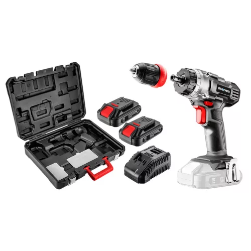 GRAPHITE akkus gépkészlet, 18V Li-ion. Energy+ akkumulátorokkal kompatibilis. A készlet tartalma: akkus fúró-csavarozó (58G022) két 2.0Ah akkumulátor (58G001) és töltő (58G002) műanyag kofferben. A koffer további rekeszekkel rendelkezik a kiegészítők számára. Műszaki adatok akkus fúró/csavarozó 18V, Li-Ion, fordulatszám I: 0-350 min⁻¹ II: 0-1250 min⁻¹, jobbra/balra, kulcs nélküli gyors tokmány 0,8-10 mm, 19 pozíciós tengelykapcsoló (valamint fúró opció), forgatónyomaték (puha/kemény): 28/44 Nm,motorfék, tömege 1.1 kg; akkumulátortöltő Energy+, 2.3A; 2 elem: 2.0Ah 18V, Li-Ion 2.0Ah.