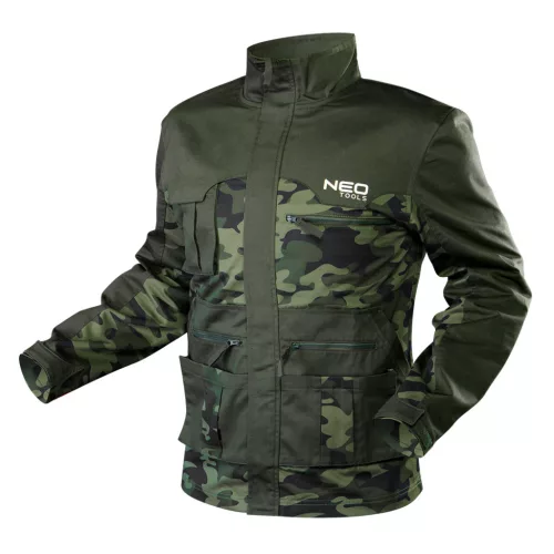 NEO munkadzseki, CAMO termékcsalád, kiváló minőségű pamut-poliészter szövetből készül. A munkadzseki a speciális kialakításának és a szabályozható ujjvégeknek valamint a magas gallérnak köszönhetően biztosítja a kényelmes használatot. A termék cipzáros, multifunkciós, valamint patentzáras zsebekkel rendelkezik. A dupla anyag a vállban ellenáll a mechanikai sérüléseknek. A munkadzsekit kiemeli a kivételes terepminta és a modern szabása ami lehető teszi a termék munka utáni viselését. A CE európai tanúsítványa garantálja minőségét. A NEO márka a professzionális igényeket is kielégíti.