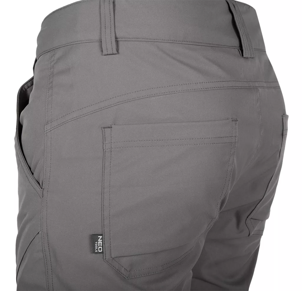 NEO Munkásnadrág, OUTDOOR, 2 irányú sztreccs anyag, 185g/m2, szürke. 2 way stretch anyagból készült munkanadrág, "cotton touch twill" szövéssel. Összetétele 100% poliészter, súlya 185 g/m2. A NEO TOOLS nadrág univerzális szürke színű. Combján cipzáras zsebekkel, hátán pedig lapos, tágas zsebekkel rendelkezik. A széles derékpántnak köszönhetően kényelmes viseletet biztosít. A NEO TOOLS munkanadrág profilozott térdekkel, a hátsó zsebén logós címkével és névtáblával rendelkezik. Számos méretben kapható.