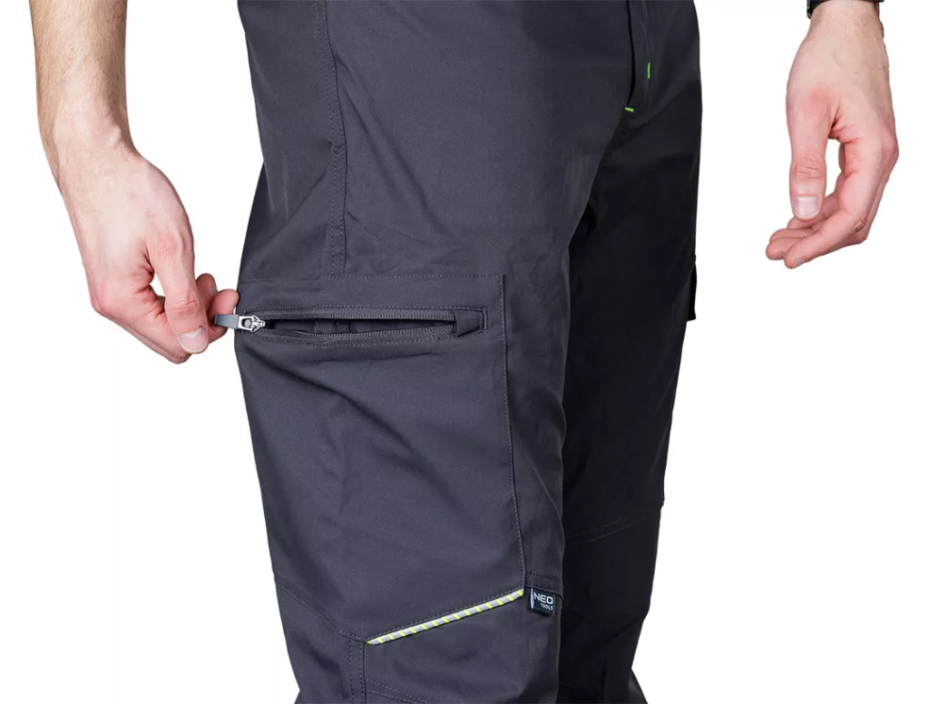NEO 81-298-1 MUNKÁSNADRÁG, MIX&MATCH, SZTRECCS ANYAG, 135G/M2, SZÜRKE. A Mix&Match sorozathoz tartozó, strapabíró nadrág, amely lehetővé teszi a munkaruhák tetszés szerinti összeállítását.Rugalmas és kényelmes viseletű, 100% poliészterből készült, 135 g/m2 súlyú sztreccs anyagból. Szürke, univerzális színüknek köszönhetően számos feladatra alkalmasak. A fényvisszaverő betétek viszont modern megjelenést kölcsönöznek nekik, és növelik a sötétedés utáni használat biztonságát. A NEO TOOLS munkanadrágok további fényvisszaverő elemekkel rendelkeznek a profilozott térdeken. A névtábla lehetővé teszi a személyre szabást professzionális környezetben. A nadrág megfelel a CE EN ISO 13688:2013 szabványnak, és felbecsülhetetlen értéket képvisel a mindennapi használatban a szakemberek és a barkácsolás szerelmesei számára.