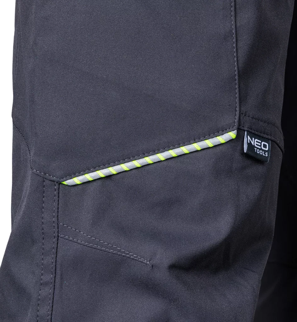 NEO 81-298-1 MUNKÁSNADRÁG, MIX&MATCH, SZTRECCS ANYAG, 135G/M2, SZÜRKE. A Mix&Match sorozathoz tartozó, strapabíró nadrág, amely lehetővé teszi a munkaruhák tetszés szerinti összeállítását.Rugalmas és kényelmes viseletű, 100% poliészterből készült, 135 g/m2 súlyú sztreccs anyagból. Szürke, univerzális színüknek köszönhetően számos feladatra alkalmasak. A fényvisszaverő betétek viszont modern megjelenést kölcsönöznek nekik, és növelik a sötétedés utáni használat biztonságát. A NEO TOOLS munkanadrágok további fényvisszaverő elemekkel rendelkeznek a profilozott térdeken. A névtábla lehetővé teszi a személyre szabást professzionális környezetben. A nadrág megfelel a CE EN ISO 13688:2013 szabványnak, és felbecsülhetetlen értéket képvisel a mindennapi használatban a szakemberek és a barkácsolás szerelmesei számára.