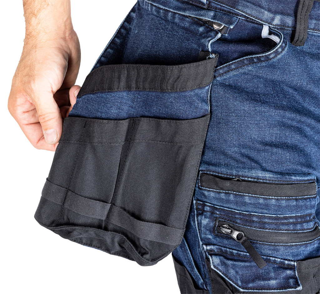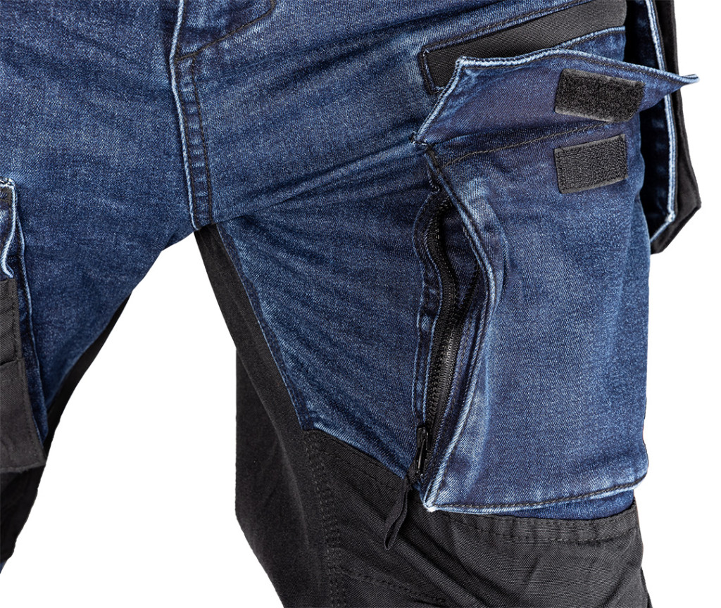 Neo Tools Farmer munkásnadrág, Denim, 82% pamut, Oxford szövet, Cordura betétek, cippzáras zsebek, kék-fekete, M
