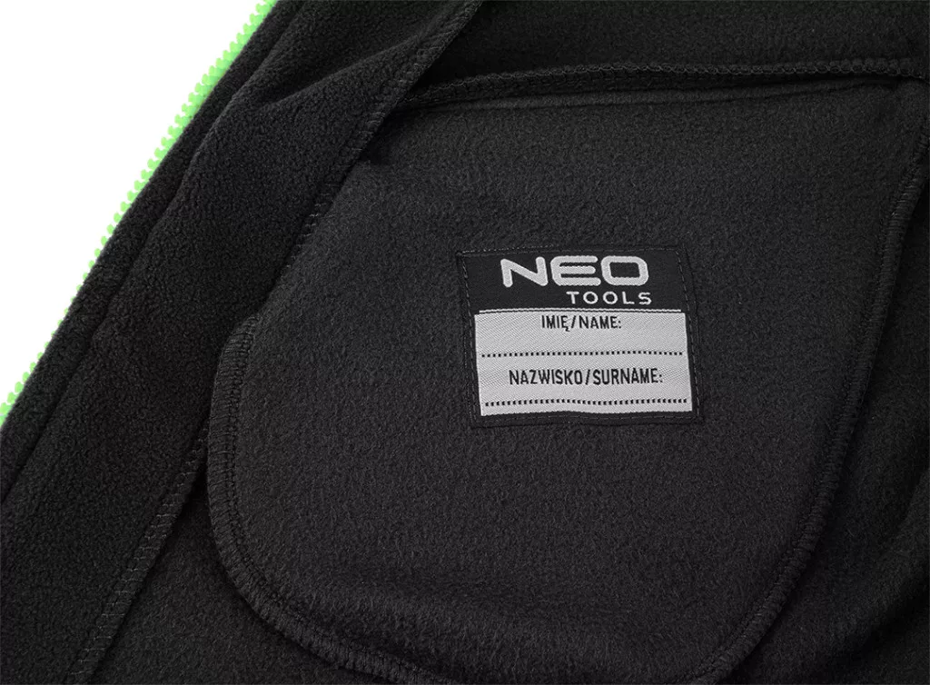 NEO TOOLS PREMIUM Munka Fleece - Stílus és Tartósság Minden Helyzetben.Ismerje meg a NEO TOOLS PREMIUM munka fleece-jét, amely a fekete színével és Cordura megerősítéseivel a legjobb választás a mindennapi munkavégzés és szabadidős tevékenységek során. Ez a prémium ruhadarab a kényelem és a tartósság jegyében készült, hogy Ön minden helyzetben kiemelkedjen.Kiváló Anyagminőség:A PREMIUM munka fleece 100% poliészterből készült, 300 g/m² súlyú, amely biztosítja a kiváló hőszigetelést és a hosszú élettartamot. A vállakon és az ujjakon található Cordura megerősítések extra védelmet és tartósságot nyújtanak, ellenállva a mindennapi igénybevételnek.Modern és Funkcionális Dizájn:Az ujjakon és a háton található fényvisszaverő nyomtatás, valamint a trendeknek megfelelő neonszínű cipzárak és ujj- és zsebszegélyek nemcsak a biztonságot növelik, hanem divatos megjelenést is biztosítanak. Ez a modern dizájn garantáltan vonzza a tekintetet.Ergonomikus Kialakítás:A NEO TOOLS munka fleece profilozott ujjakkal és bordázott mandzsettával rendelkezik, amelyek kényelmet és mozgásszabadságot biztosítanak. A három cipzáras zseb elegendő helyet kínál az apróságok tárolására, míg a belső névtábla segít a ruhadarab személyre szabásában.Biztonsági és Minőségi Tanúsítványok:Ez a ruhadarab CE tanúsítvánnyal rendelkezik és megfelel az EN ISO 13688:2013 szabványnak, ami garantálja a minőséget és a biztonságot. Legyen szó munkahelyi feladatokról vagy szabadidős tevékenységekről, a NEO TOOLS PREMIUM munka fleece minden helyzetben megállja a helyét.Válassza a NEO TOOLS PREMIUM munka fleece-t, és tapasztalja meg a minőségi munkaruházat új szintjét!