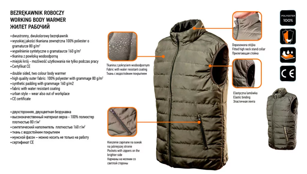 A NEO munkamellény Camo szériához tartozik, mindkét oldala használható- kifordítható ezért különböző körülmények között alkalmazható praktikus megoldás. Szintetikus bélése miatt a termék könnyű, de hatékonyan véd a hideg ellen. Kiváló minőségű, vízálló bevonattal ellátott anyagból készült. A zipzáras zsebek a mellény világosabb oldalán találhatóak. Konstrukciójának és rugalmas alapanyagának köszönhetően könnyen alkalmazkodik a test körvonalához. Városi stílusú, divatos színekkel rendelkező, így munka után is hordható. A termék EN ISO 13688:2013 szabvány szerinti kivitelezése és az európai tanúsítványa minőségének garanciája. A NEO márka a professzionális igényeket is kielégíti.