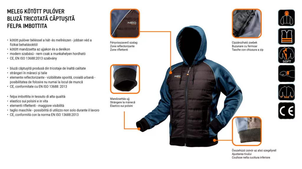 NEO extrán szigetelt munkadzseki, könnyű, meleg és légáteresztő. Megerősített softshell anyag vállban, az ujjakon és oldalt, ami által jobban ellenáll a sérüléseknek. A rugalmas összehúzók az ujjak és az alsó szegélynél segítik a meleg megőrzését, maximálisan komfortossá téve a viseletét. A dzsekit kiemeli a divatos-modern szabás, melynek révén munka után is viselhető. A termék EN ISO 13688:2013 szabvány szerinti kivitelezése és az európai tanúsítványa minőségének garanciája. A NEO márka a professzionális igényeket is kielégíti.