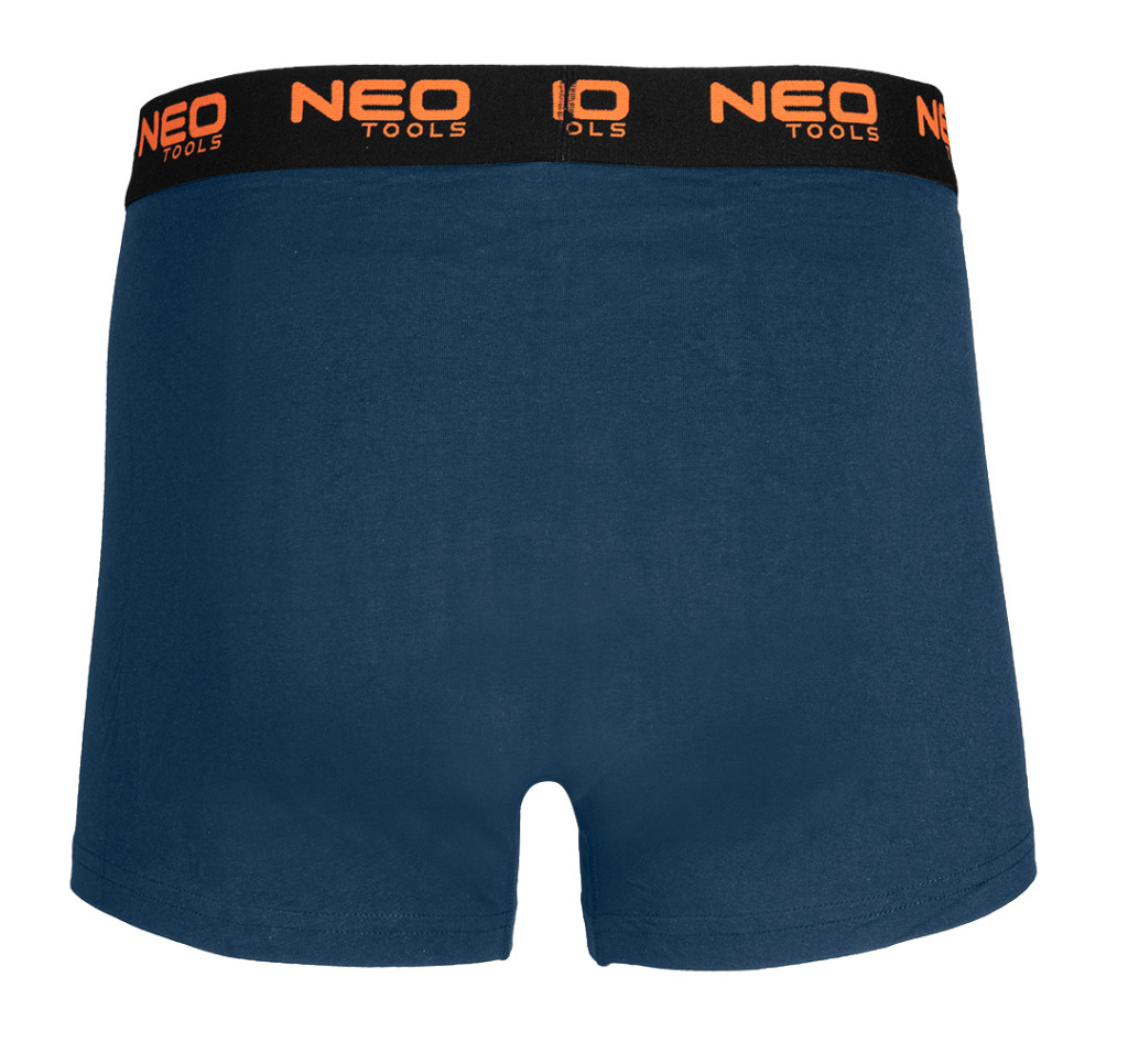 NEO Boxeralsó, 95% pamut, 2% elasztán, 3db/cs, olivazöld, kék, fekete. Jellemzője a 180 g/m2 súlyú elasztán anyag. Narancssárga logóval és puha jacquard gumival ellátott. Lapos elülső panelvarrással, egy extra panellel az ágyékban és oldalsó varrás nélkül. A sima kidolgozású szárak szintén hozzájárulnak a kényelemhez. Az alsónemű belső oldalán méretcímke található az összetételi és ápolási utasításokkal. A boxeralsó egy ablakkal ellátott kartondobozba van csomagolva. A ruhadarab a NEO TOOLS saját márkájú dizájnjához tartozik.