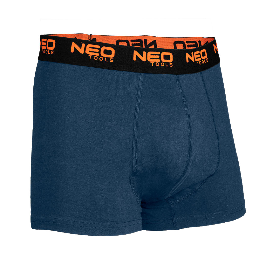 NEO Boxeralsó, 95% pamut, 2% elasztán, 3db/cs, olivazöld, kék, fekete. Jellemzője a 180 g/m2 súlyú elasztán anyag. Narancssárga logóval és puha jacquard gumival ellátott. Lapos elülső panelvarrással, egy extra panellel az ágyékban és oldalsó varrás nélkül. A sima kidolgozású szárak szintén hozzájárulnak a kényelemhez. Az alsónemű belső oldalán méretcímke található az összetételi és ápolási utasításokkal. A boxeralsó egy ablakkal ellátott kartondobozba van csomagolva. A ruhadarab a NEO TOOLS saját márkájú dizájnjához tartozik.