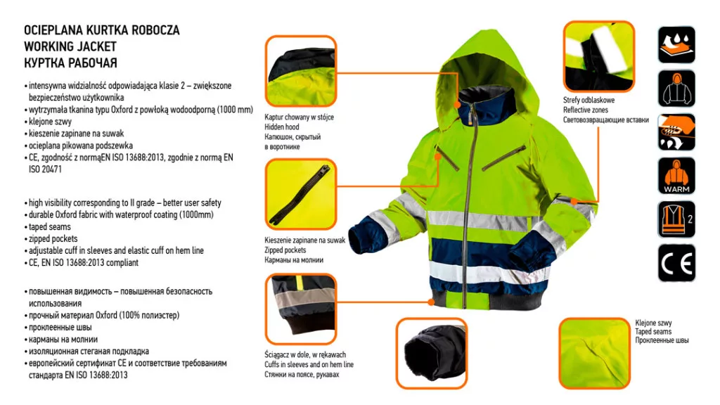 NEO láthatósági bélelt kabát kimagasló minőségű, tartós Oxford 300D anyagból. Viselője biztonságát növelő praktikus megoldás, legyen az nappali világítási körülmények között, vagy sötétben, a gépjárművek lámpáinak fényében. A PN-EN ISO 20471:2013 szabvány szerint 2. osztályú láthatóságot biztosít. Tartós, fényvisszaverő vízálló anyagból, fényvisszaverő zónák alkalmazásával készül. A könnyű poliészter bélés biztosítja a komfortot a fagyos napokban. A ragasztott varrás és az 1000 mm vízállóságú anyag lehetővé teszi a munkavégzést az esőben. A rugalmas összehúzó zsinór az ujjakban és a szabályozható összehúzó a derékban további védelmet biztosítanak a hideg és a szél ellen. A cipzározott zsebekben személyes tárgyak biztonságosan tárolhatók. A termék EN ISO 13688:2013 szabvány szerinti kivitelezése és az európai tanúsítványa minőségének garanciája.