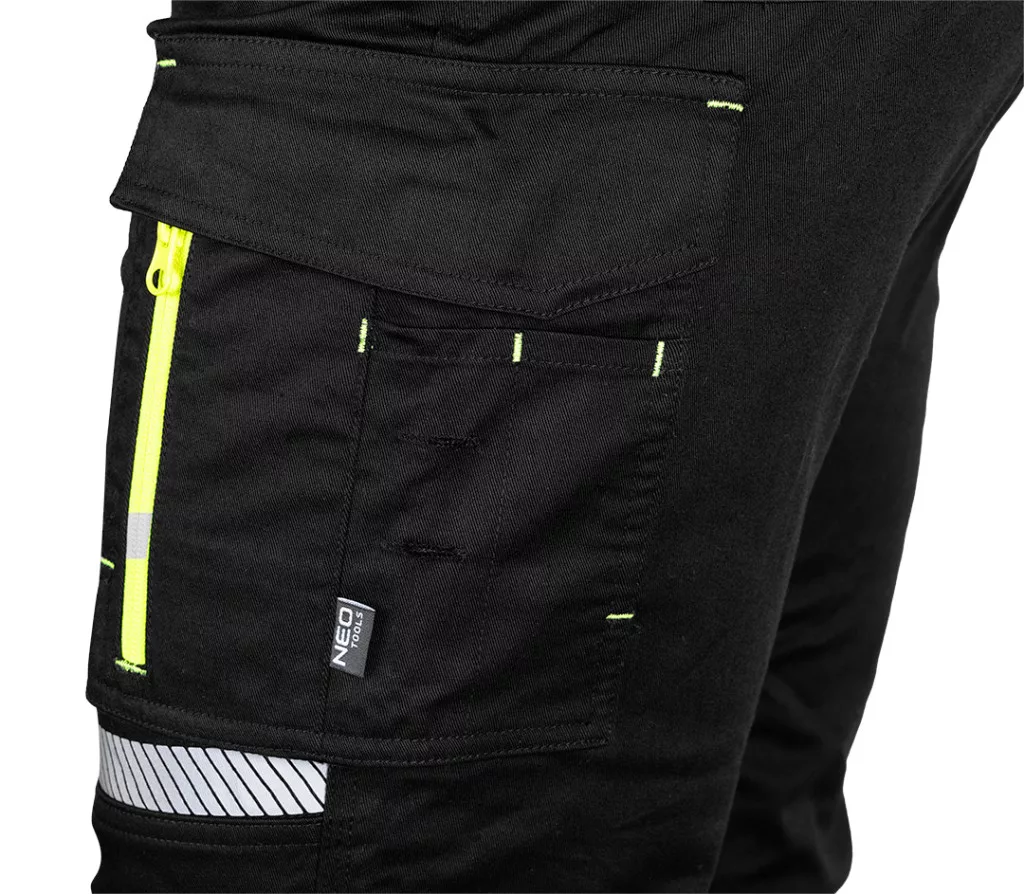 NEO Láthatósági munkásnadrág, Mix&Match, 1. osztályú láthatóság, 240g/m2, 58%pamut, 40%poliészter,2%elasztán, külső zsebekkel, profilozott térdbetétekkel, fekete-sárga. A sárga fluoreszkáló elemek és a fényvisszaverő csíkok növelik a felhasználó láthatóságát és biztonságát. A ruhadarab súlya 240 g/m2, anyagösszetétele: 58% pamut, 40% poliészter és 2% elasztán, megfelelő tartósságot és rugalmasságot biztosít. Háromszorosan varrott varrásokkal és profilozott térdekkel ellátva biztosítja a viselési kényelmet és a robusztusságot hosszú hónapokig tartó használat során. A NEO TOOLS nadrág praktikus szerszámhorgokkal, többfunkciós zsebekkel, térdvédő zsebbel és azonosító címkével rendelkezik. A térd fölötti fényvisszaverő nyomtatásnak köszönhetően további láthatóságot biztosít a munkahelyen. A CE tanúsítvánnyal rendelkező nadrág az EN ISO 13688:2013 szabványnak is megfelel.