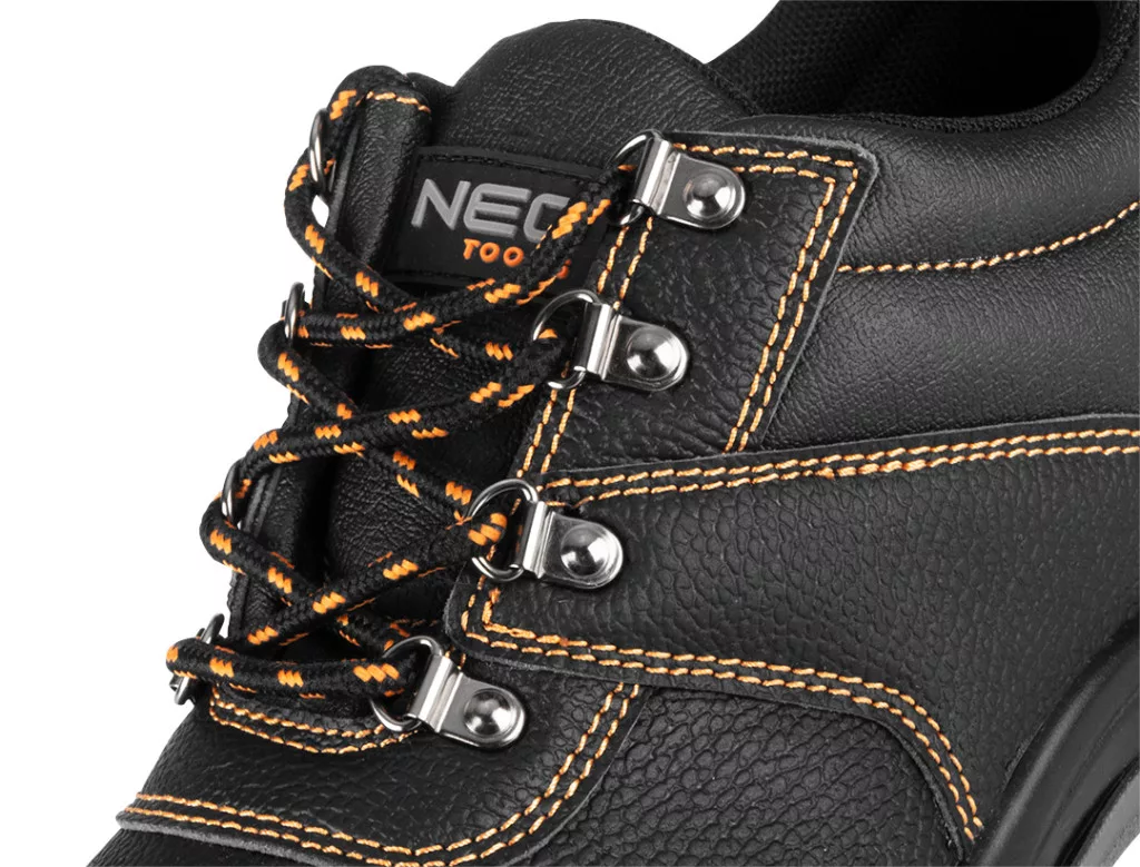 NEO 82-164-40 Munkavédelmi cipő, S3 SR FO, acélbetéttel. Többcélú biztonsági lábbeli. A dombornyomott hasított bőrből készült bőr felsőrésznek és a beépített sarokvédőnek köszönhetően kényelmet biztosít a hosszú távú munkavégzés során. A 200J ütési energiájú ütések ellen védő acél lábfejvédő és az acél talpátszúrásgátló betét biztonságot nyújt a felhasználóknak. A NEO TOOLS cipő kétkomponensű anyagból készült PU/PU talpa biztosítja az olajokkal, benzinnel és más szerves oldószerekkel szembeni ellenállást, valamint a glicerinnel bevont kerámialapokon való csúszásállóságot. A félcipőkre jellemzőek továbbá az antielektrosztatikus tulajdonságok, a sarokrész energiaelnyelése vagy a szivárgással és átázással szembeni ellenállás megnövelt paraméterei. Az EN ISO 20345 szabvány szerint biztonsági lábbeliként vannak besorolva. A NEO TOOLS márkájú munkacipőt a szakemberek és a barkácsolás szerelmesei számára ajánljuk.
