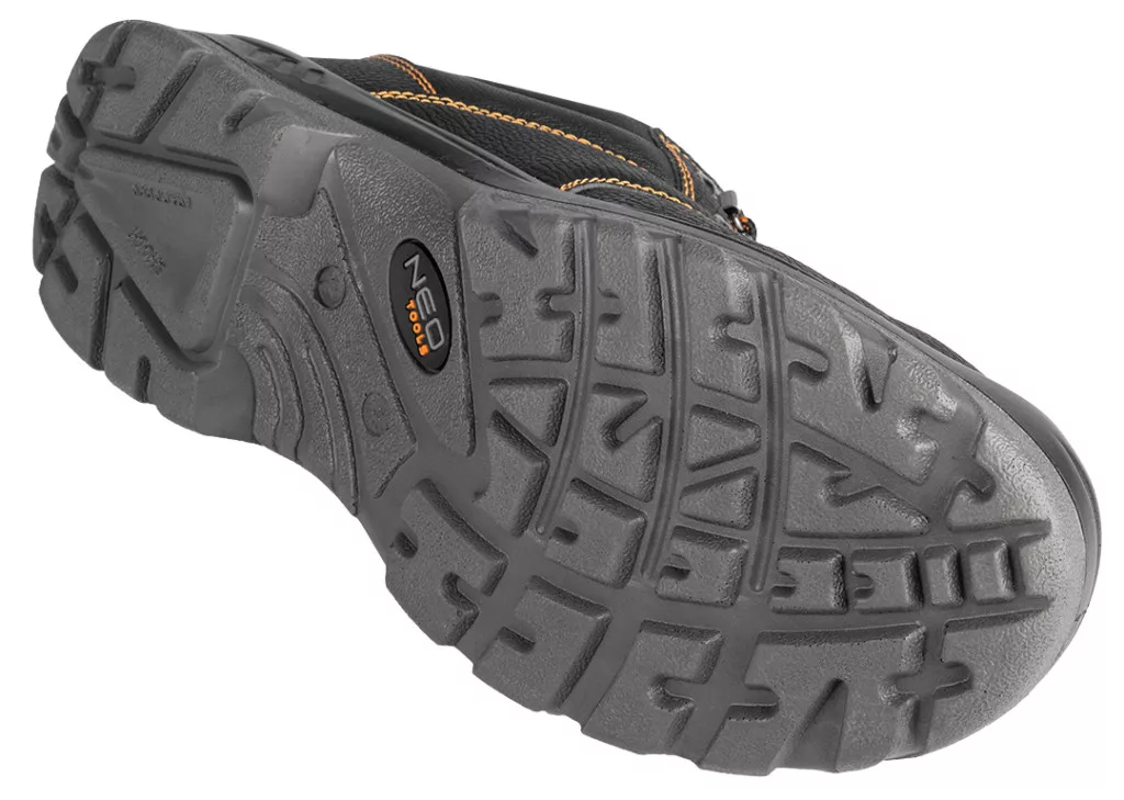 NEO 82-164-41 Munkavédelmi cipő, S3 SR FO, acélbetéttel. Többcélú biztonsági lábbeli. A dombornyomott hasított bőrből készült bőr felsőrésznek és a beépített sarokvédőnek köszönhetően kényelmet biztosít a hosszú távú munkavégzés során. A 200J ütési energiájú ütések ellen védő acél lábfejvédő és az acél talpátszúrásgátló betét biztonságot nyújt a felhasználóknak. A NEO TOOLS cipő kétkomponensű anyagból készült PU/PU talpa biztosítja az olajokkal, benzinnel és más szerves oldószerekkel szembeni ellenállást, valamint a glicerinnel bevont kerámialapokon való csúszásállóságot. A félcipőkre jellemzőek továbbá az antielektrosztatikus tulajdonságok, a sarokrész energiaelnyelése vagy a szivárgással és átázással szembeni ellenállás megnövelt paraméterei. Az EN ISO 20345 szabvány szerint biztonsági lábbeliként vannak besorolva. A NEO TOOLS márkájú munkacipőt a szakemberek és a barkácsolás szerelmesei számára ajánljuk.