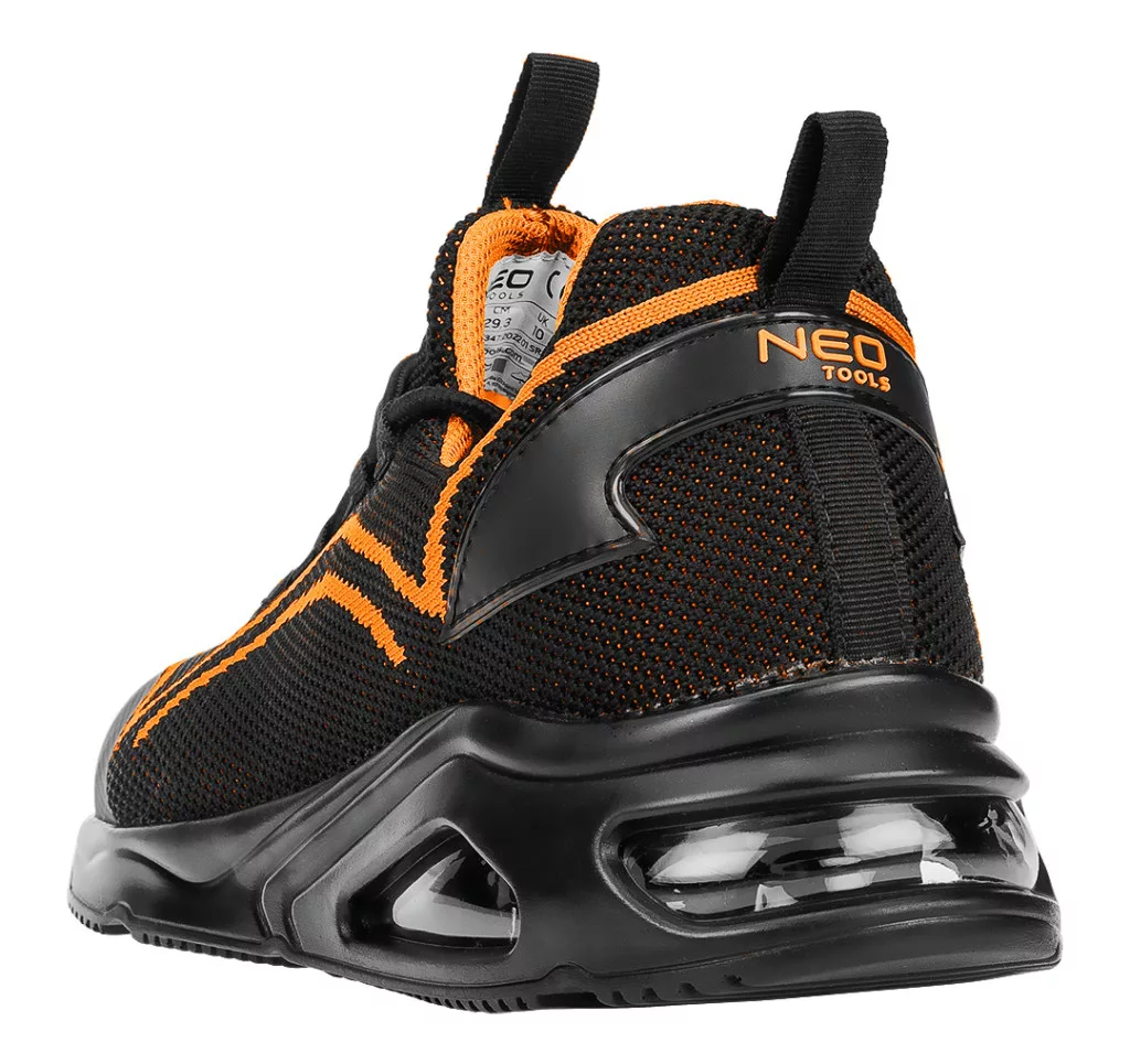 NEO 82-172 MUNKAVÉDELMI CIPŐ, S1 SR, FEKETE-NARANCS, NEO AIR, ACÉLBETÉTTEL, LÉGPÁRNÁS TALPPAL, FÉNYVISSZAVERŐ ELEMEKKEL. Acél talpbetéttel és fényvisszaverő elemekkel ellátva sokoldalúság és praktikusság jellemzi őket. Textil béléssel és felsőrésszel rendelkezik. A puha zónákkal ellátott HI-POLY habszivacs talpbetét megfelelő viselési kényelmet biztosít - akárcsak a légpárnával ellátott PU talp. A NEO TOOLS munkacipő az SR kategóriában készül, amelyet a glicerinnel bevont kerámialapra helyezett csúszásgátlás jellemez. A cipő védelmet nyújt a 200J energiájú ütésekkel szemben. Ez a NEO TOOLS sportos megjelenésű cipő, antisztatikus tulajdonságokkal rendelkezik, amely számos szakmai és mindennapi helyzetben hasznosnak bizonyul.