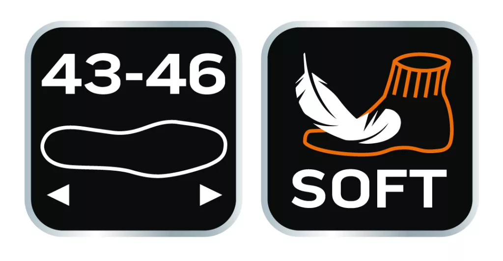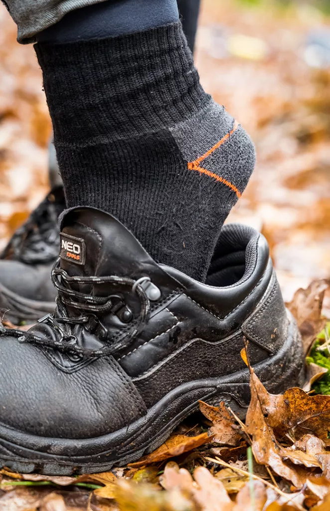NEO munkazokni kiváló minőségű pamutból készül, poliészterel és elasztánnal, továbbá akrillal amely biztosítja a kényelmet és a higiéniát a munka során. A lábujjakon és a sarkakon megerősített, ez védelmet biztosít a gyors kopás ellen. Fekete színben narancssárga és szürke betétekkel.