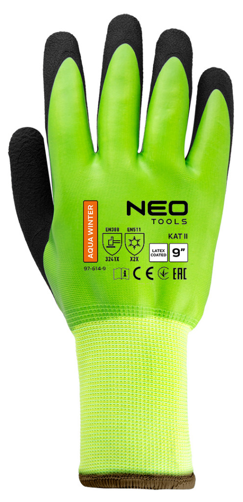 NEO 97-614 Munkakesztyű, AquaWinter, hőszigetelt, vízálló, dupla latex bevonatú poliészter. A NEO TOOLS márkájú kesztyűk dupla latex bevonattal rendelkeznek (sima + hab) és a II, 3241X, X2X kategóriába tartoznak. Az EN388, EN420 és EN511 szabványok szerint tanúsítottak, jellemző rájuk a kopásállóság (3 a 0-tól 4-ig terjedő skálán), az éles tárgyakkal való vágásállóság (2 a 0-tól 5-ig terjedő skálán), a szakadásállóság (4 a 0-tól 4-ig terjedő skálán), a szúrásállóság (1 a 0-tól 4-ig terjedő skálán) és az EN ISO 13997 X szabvány szerinti vágásállóság. A NEO TOOLS AquaWinter munkakesztyűk ellenállnak a hideggel való érintkezésnek, és a víz behatolásának is. Jól illeszkednek a kézre, és a durva textúrájú latexréteg habos felületének köszönhetően biztos fogást és korlátozott csúszást biztosítanak. Ezek a NEO TOOLS vízálló munkakesztyűk a téli hónapok elengedhetetlen kellékei.