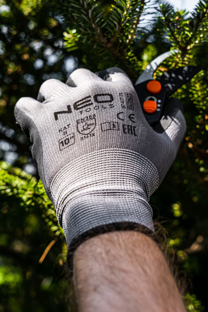 A NEO munkakesztyű védi a kezét a szennyeződésektől, karcolásoktól és a munka közbeni káros hatásoktól. Latex bevonatú nejlonból készült. Használat közben kényelmet biztosítanak, magabiztos fogást tesznek lehetővé, még a kisebb tárgyak esetében is, ugyanakkor megakadályozzák, hogy a szerszámok kicsússzanak a kezéből. A CE-jelölés biztonsági garancia arra, hogy a termék megfelel az összes uniós követelménynek. A következő méretekben kapható: 8", 9", 10".
