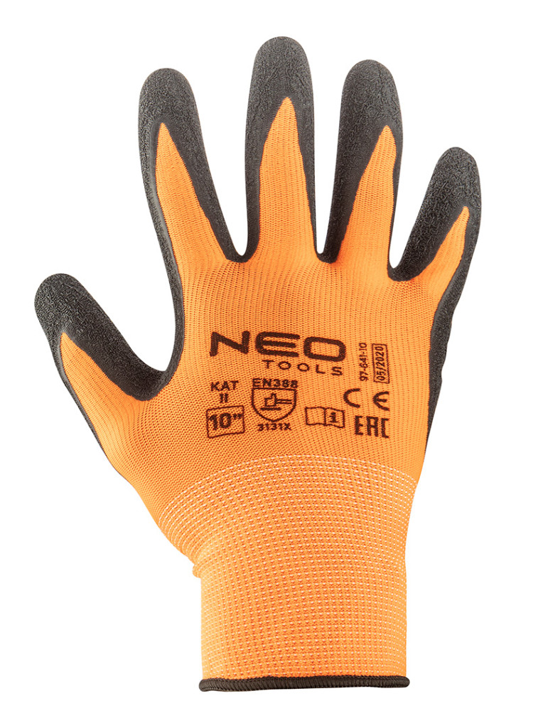 A NEO munkakesztyű védi a kezét a szennyeződésektől, karcolásoktól és a munka közbeni káros hatásoktól. Latex bevonatú poliészterből készült. Használat közben kényelmet biztosítanak, magabiztos fogást tesznek lehetővé, még a kisebb tárgyak esetében is, ugyanakkor megakadályozzák, hogy a szerszámok kicsússzanak a kezéből. A CE-jelölés biztonsági garancia arra, hogy a termék megfelel az összes uniós követelménynek. Méretekben kapható: 8", 9", 10".