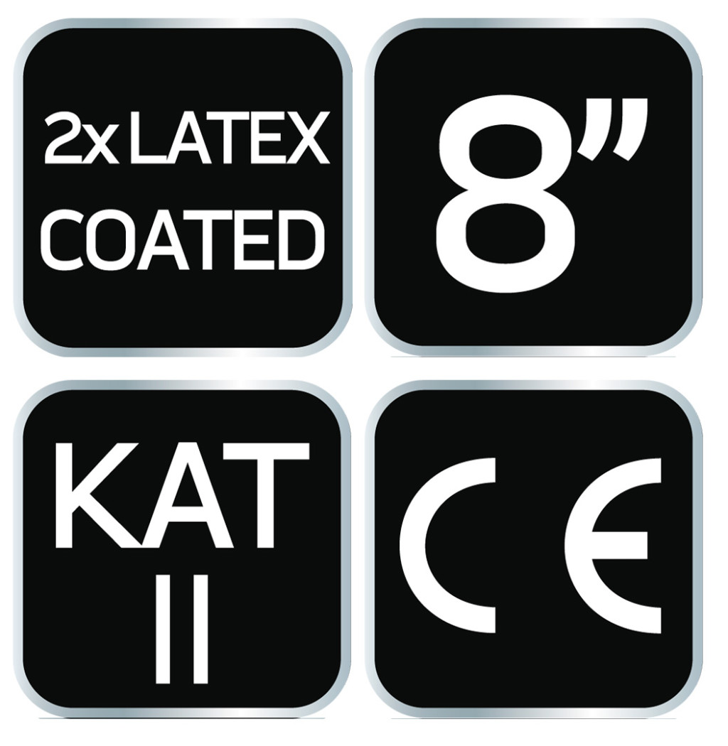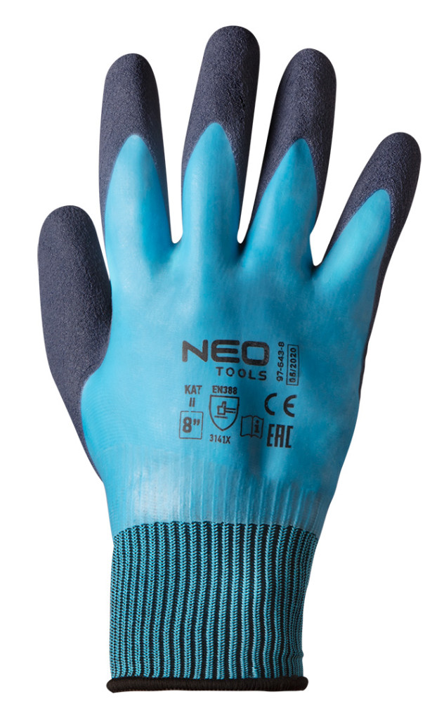 A NEO munkakesztyű védi a kezet a szennyeződések, karcolások és káros körülmények ellen munka közben. Kettős latexréteggel borított poliészterből készült. Használat közben kényelmet biztosítanak, szilárd fogást tesznek lehetővé, még a kisebb tárgyak esetében is, ugyanakkor megakadályozzák, hogy a szerszámok kicsússzanak a kezéből. A CE-jelölés biztonsági garancia, amely bizonyítja, hogy a termék megfelel az összes uniós követelménynek. Méretekben kapható: 8", 9", 10".