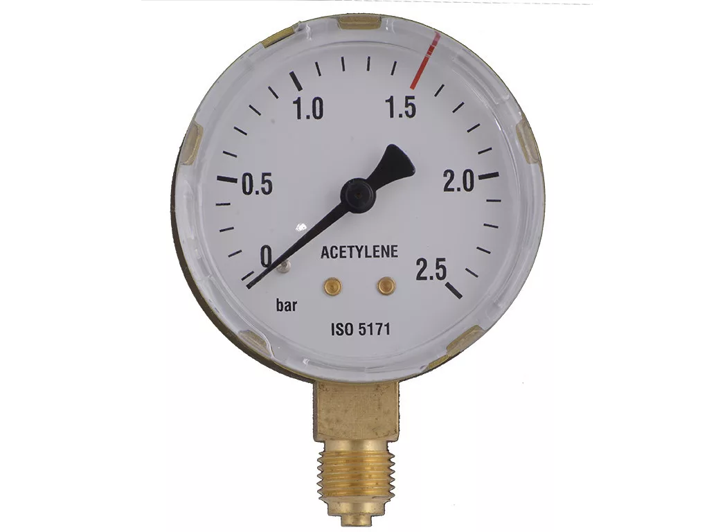 1/4"-os menettel, alumínium roppanógyűrűs tömítéssel ellátott 63 mm átmérőjű, acetilén manométer, 2,5/1,5 baros.