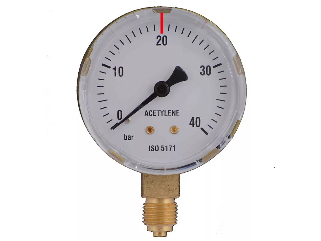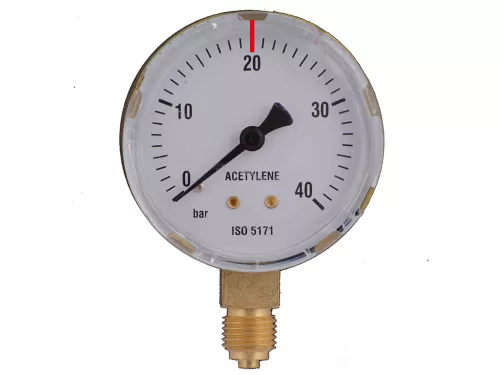 1/4"-os menettel, alumínium roppanógyűrűs tömítéssel ellátott 63 mm átmérőjű, acetilén manométer, 40/20 baros.