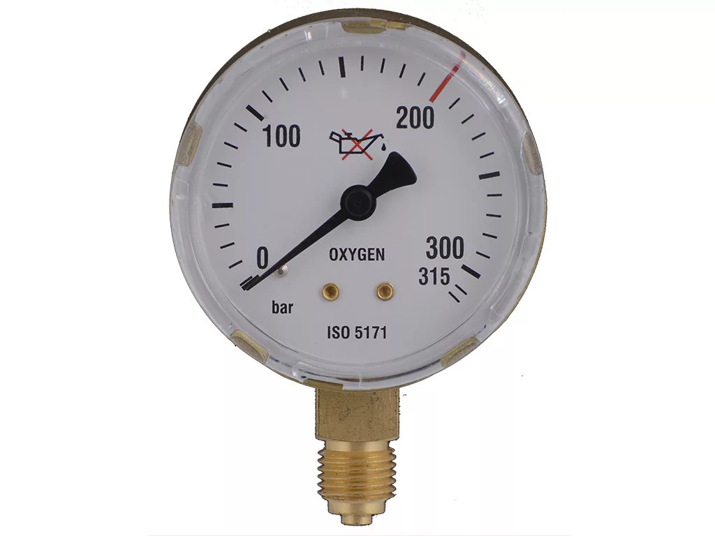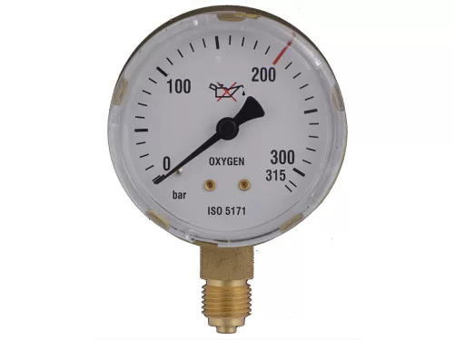 1/4"-os menettel, alumínium roppanógyűrűs tömítéssel ellátott 63 mm átmérőjű, oxigén manométer, 315/200 baros.